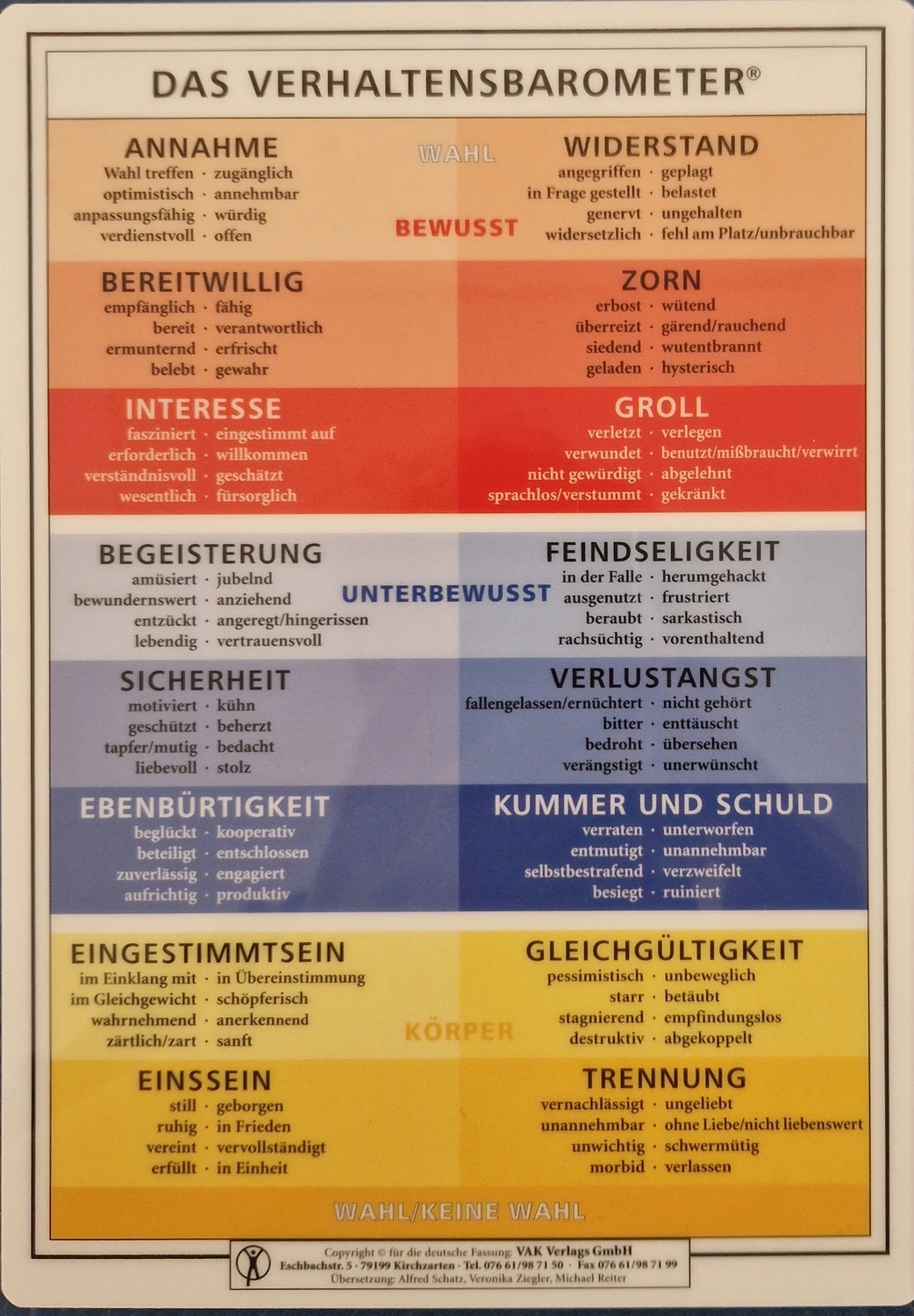 VerhaltensbarometerEs ist wohl eines der bekanntesten Werkzeuge der Kinesiologie überhaupt. Die Urheber sagten gerne, das Barometer habe sich „selbst erfunden“. Ursprünglich als Skala mit positiven und negativen Emotionen und einem Nullpunkt dazwischen geplant, offenbarte es schnell die tiefe Philosophie der Methode: